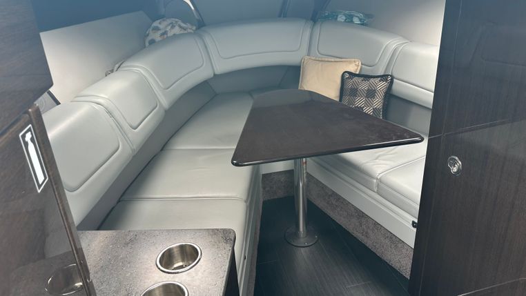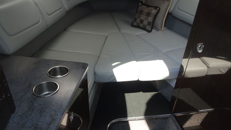 - Ultraleather™ U-shaped forward dinette lounge/double berth w/high-gloss, Deep Cherry or Ash wood table & filler cushion