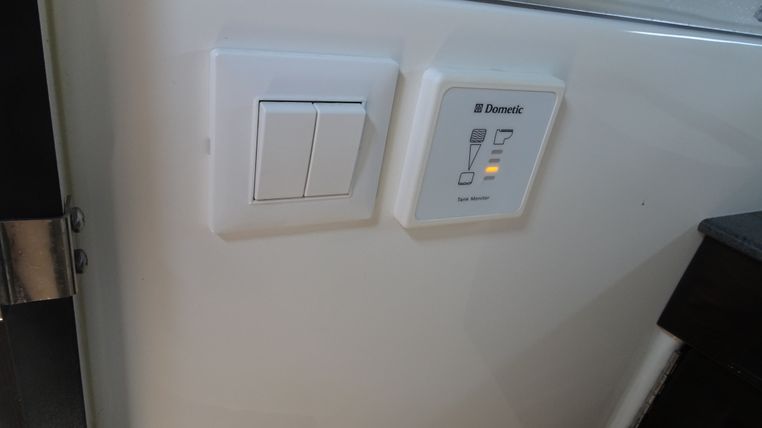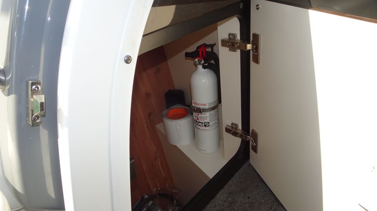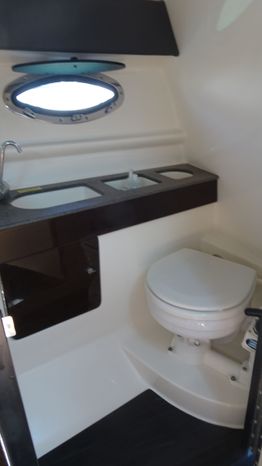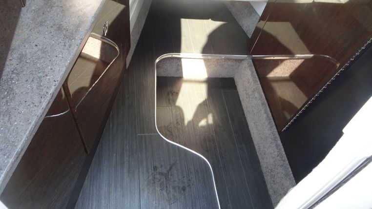 - Molded head compartment w/porcelain head unit, 22-gallon holding tank & dockside pumpout, molded vanity, sink w/faucet, mirror, Corian countertop & wood-grain finish flooring