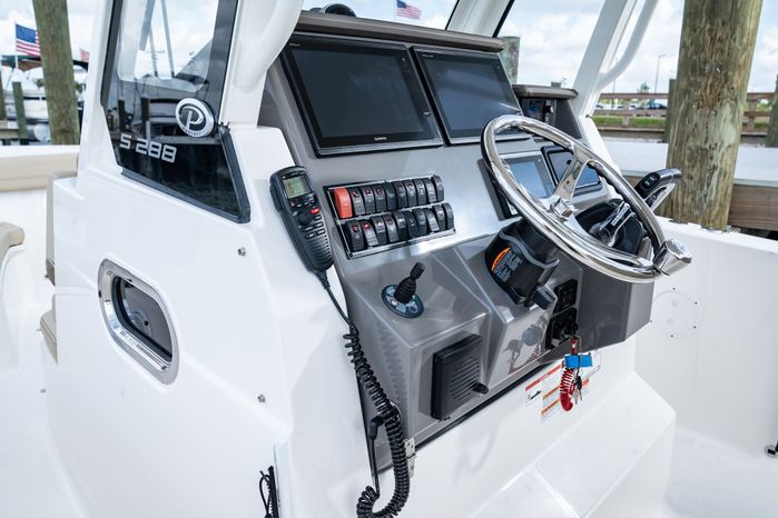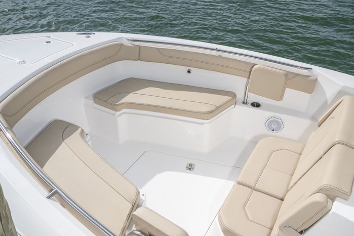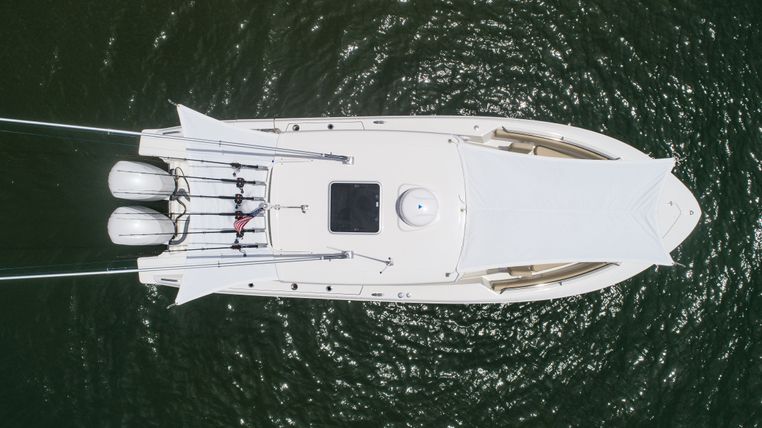 Twin Yamaha® Digital F300 V6 Offshore (Pearlescent White) w/Integrated Digital Electric Steering (DES) and Helm Master® EX Digital Electronic Control (DEC) (does not include joystick control), Multifunction Display Interface and Manual Engine Flushing System Joystick with full maneuverability (Set Point and Autopilot) Sea Mist hullside Red boot stripe Carbon helm Black canvas Aft Cockpit Mediterranean Style Sunshade (Stowable) Bow/Cockpit Table, Fiberglass (w/Dedicated Storage)