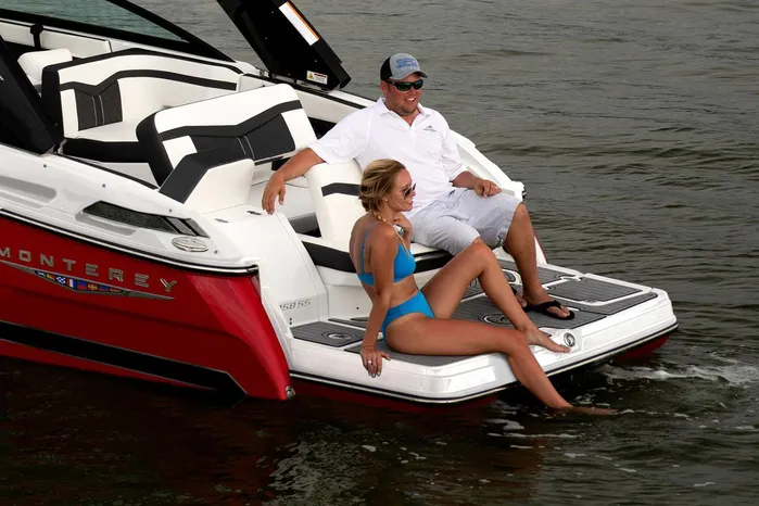 - Aft L-Lounge w/Fiberglass Bases, Sun Island Feature, Stainless Steel Stern Rail