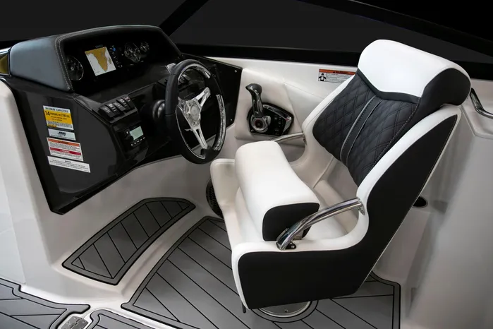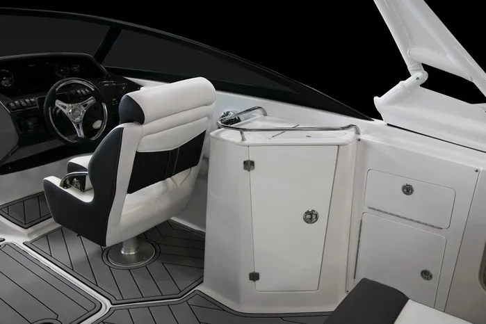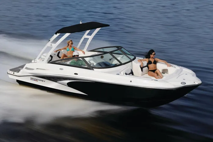 Nimble and Sporty best describes the Monterey M4. Featuring a standard wetbar sized just right for preparing a drink, or a quick snack, spacious seating, and generous dedicated storage areas, the M4 is ahead of the curve. Additional standard features include a stainless steel telescopic boarding ladder for easy access in an out of the water, a small head compartment which is located behind the port side dash, and a fusion satellite ready stereo.