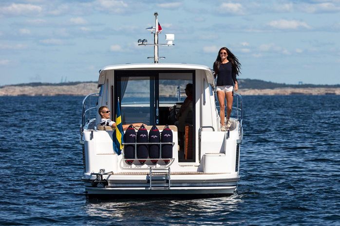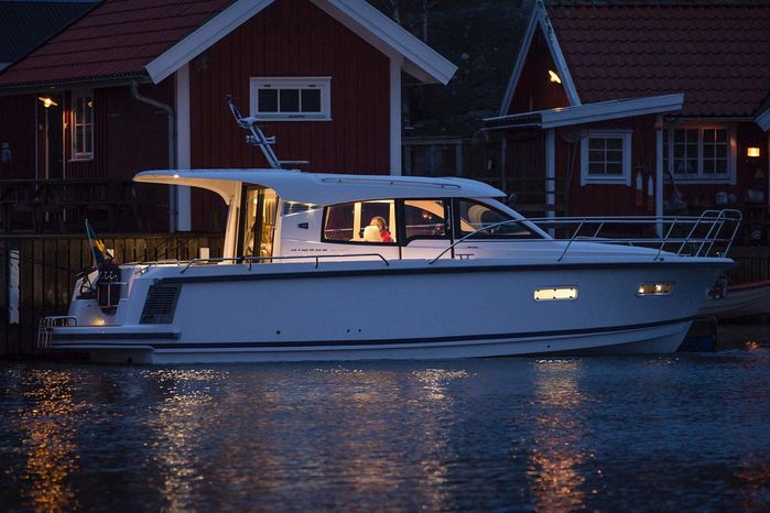 The “Sidewalk Design” is an asymmetrical deck layout where the side deck along the starboard side is extra wide, providing safe and generous freedom of movement. It makes moving about the boat from bow to stern much more convenient and enjoyable, as well as easy to get on and off the boat along the entire starboard side. The Sidewalk also allows for maximum use of the interior volume, allowing the cockpit, salon, lower deck and cabin to be larger than would otherwise be the case in a boat of this size. An important feature of the Nimbus sidewalk design concept is the large flush fitted sliding door to starboard. The sliding door provides quick access when docking alongside and enables maneuvering the boat from a standing position on the side deck.