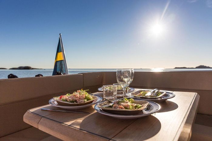 The helm has been maximized to provide the greatest possible customization and can be equipped with accessories according to individual requirements. Glued windows with a large, curved windscreen provide a great panoramic view. The salon features large flat surfaces and is both light, airy and cozy, thanks to the choice of materials and LED-lighting. The large glass roof and roof hatches provide a flood of natural light in the salon. A dinette provides plenty of room for four people to share a meal, but also converts easily into a double berth. The dining table can also fold down into a cocktail table with glass holders, making the salon a perfect place for socializing. The galley is well-equipped with ceramic gas heated glass hob with integrated ventilation, Corian top, 65-liter refrigerator and extra refrigerator/freezer box below the sofa on option.