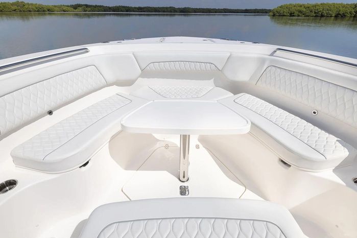 Forward Bow Seating with Insulated Storage Below, Electrically Actuated Forward Facing-Backrests for Port and Starboard Seats, Removable Forward Jumpseat (with bow table storage below), Eight (8) Drink Holders, 12V Outlets and USB (A & C) Chargers