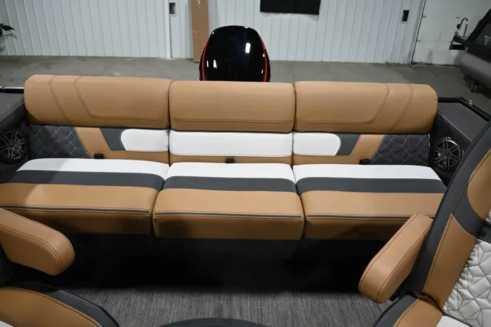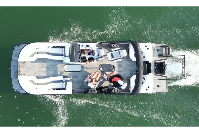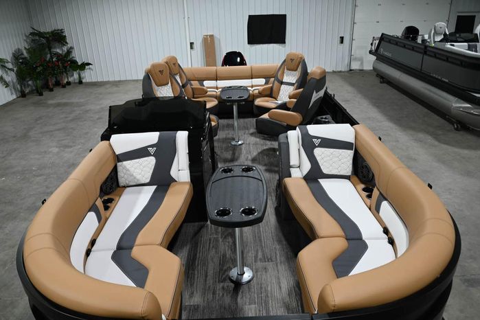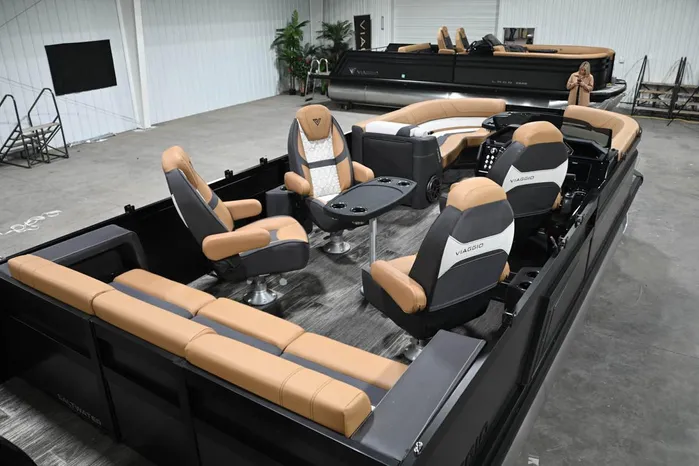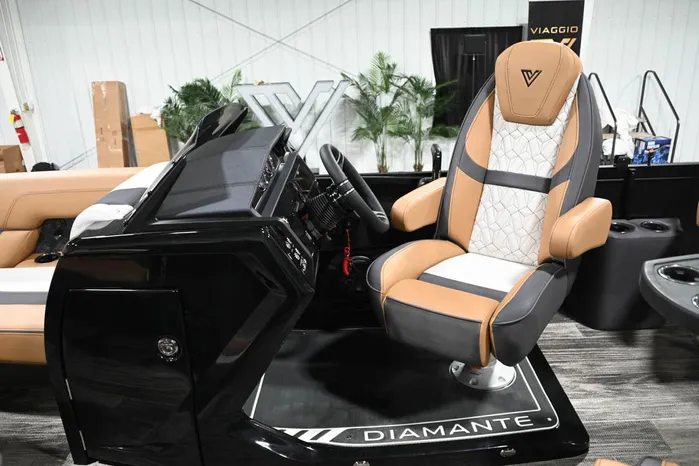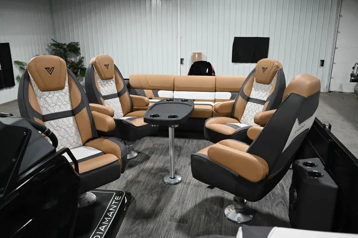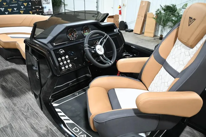 Our Diamante Q has a great layout for couples and families to enjoy a day out on the water, incorporating four captain’s chairs well positioned to have a great conversation. As with all Diamante models, this one’s available in a variety of luxurious decor and color combinations.