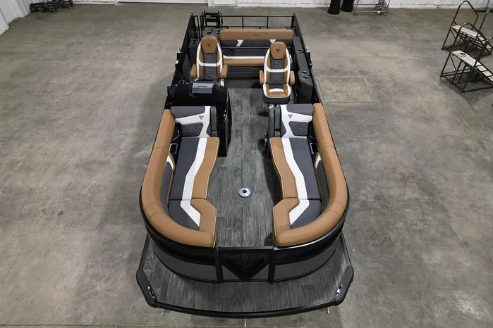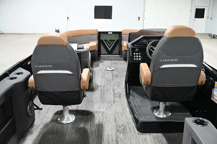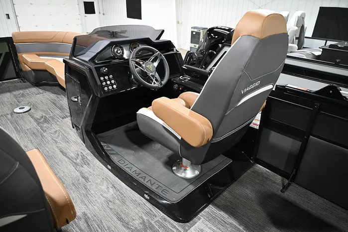 Our Diamante S-CC is the perfect boat for relaxing out on the water. With its characteristic “swingback” rear lounger, you can position the rear seat to face forward like a bench seat or face backwards making the seat into a sun deck or lounger. This version also features a co-captain’s chair, adding to the versatility of this incredible layout. As with all Diamante models, this one’s available in a variety of luxurious decor and color combinations.